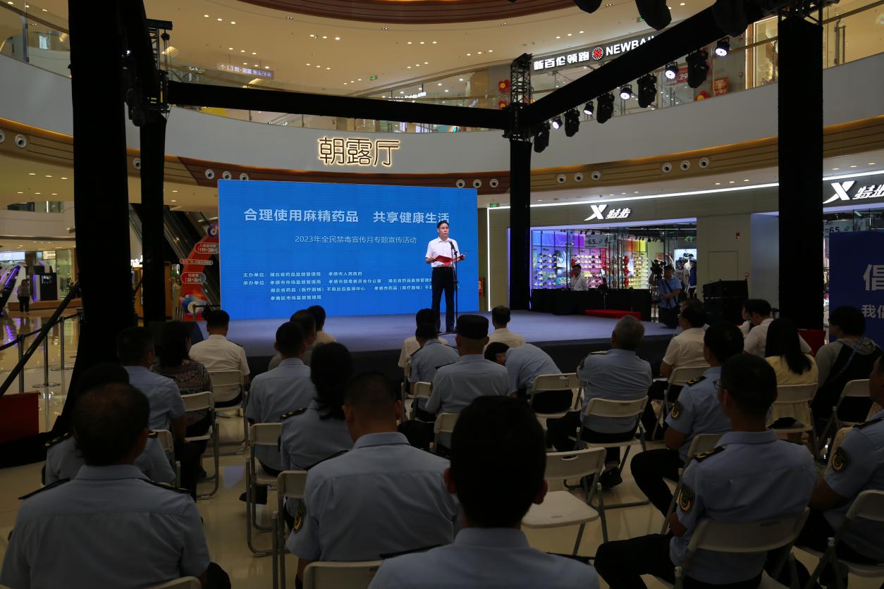 6月26日,全省2023年全民禁毒宣传月“合理使用麻精药品 共享健康生活”专题活动启动仪式在孝感城区吾悦广场隆重举行。启动仪式由湖北省药品监督管理局、孝感市人民政府主办,孝感市市场监督管理局、孝感市禁毒委员会办公室、湖北省药品(医疗器械)不良反应监测中心、孝感市药品(医疗器械)不良反应监测中心、孝南区市场监督管理局承办。