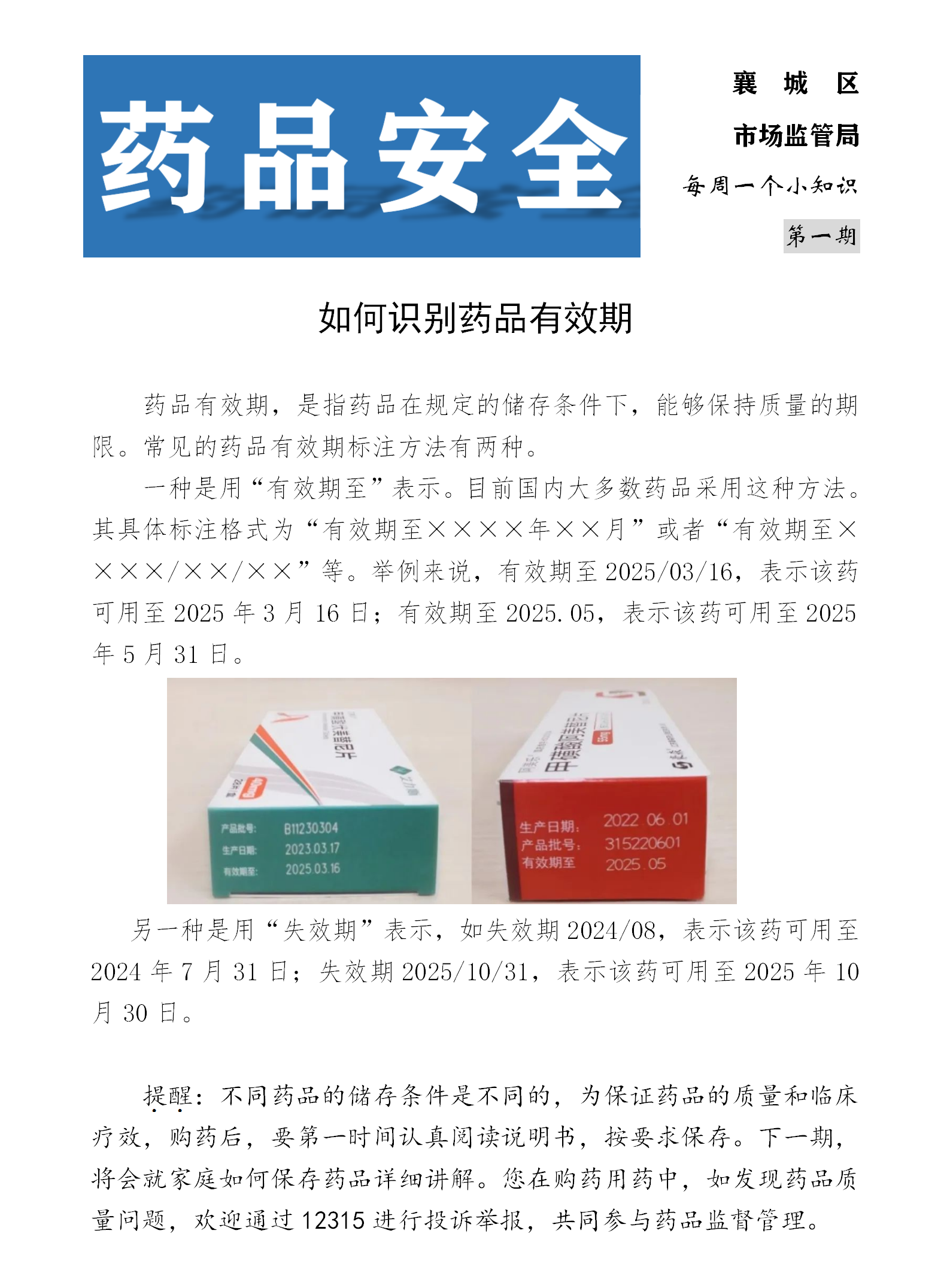 为普及药品安全知识,增强辖区居民用药安全意识,营造药品安全社会共治良好氛围,推进药品安全巩固提升行动走向深入。襄城区市场监督管理局坚持每周编发一期药品安全小知识宣传页,利用微信、QQ、公众号等多种形式广泛宣传引导,发动社区网格员转发至居民群,把药品安全知识“送进家庭”。截至目前,该局已制作三期药品安全小知识,受到居民的好评和欢迎。