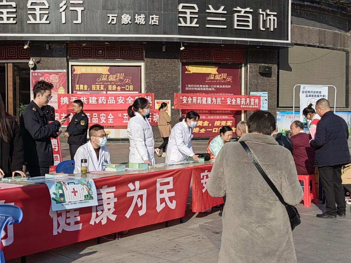 三是举行现场宣传。11月21日,枣阳市市场监管局联合枣阳市第一人民医院、晓琳药业、天济大药房在枣阳市万象城开展“安全用药 健康为民”“携手共建药品安全防线”宣传活动。活动现场,通过展板宣传、现场咨询、发放宣传资料等多种形式,监管人员与执业药师、医师为广大居民开展安全用药宣传,讲解药品安全相关知识,接受群众的用药咨询80余人次、发放宣传资料100余份,同时提供免费测血糖、量血压便民服务,全方面、多层次地提升公众安全用药意识。