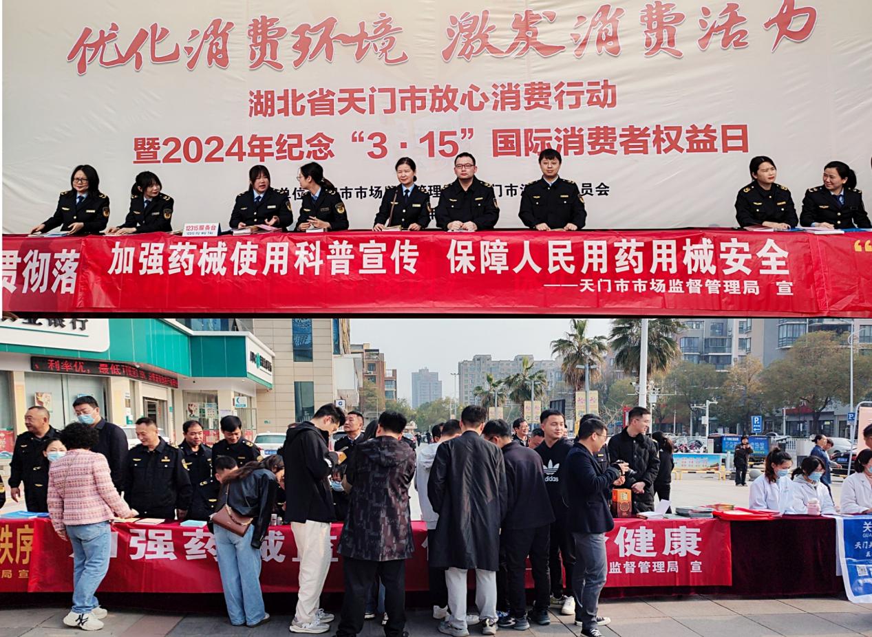 3月15日当天,天门市市场监督管理局在天门城区设立“3·15国际消费者权益日”宣传活动主会场,18个监管所设立分会场,通过设置宣传栏、咨询台、悬挂横幅标语、新闻媒体报道等多种方式进行宣传,各市场监管所到人员聚集的农贸市场、大型超市、社区等场所宣传普及药品安全科普知识及相关法律法规,并向群众现场发放药品、医疗器械、化妆品安全科普宣传资料,共计发放宣传手册2万余册、宣传单3万余份。