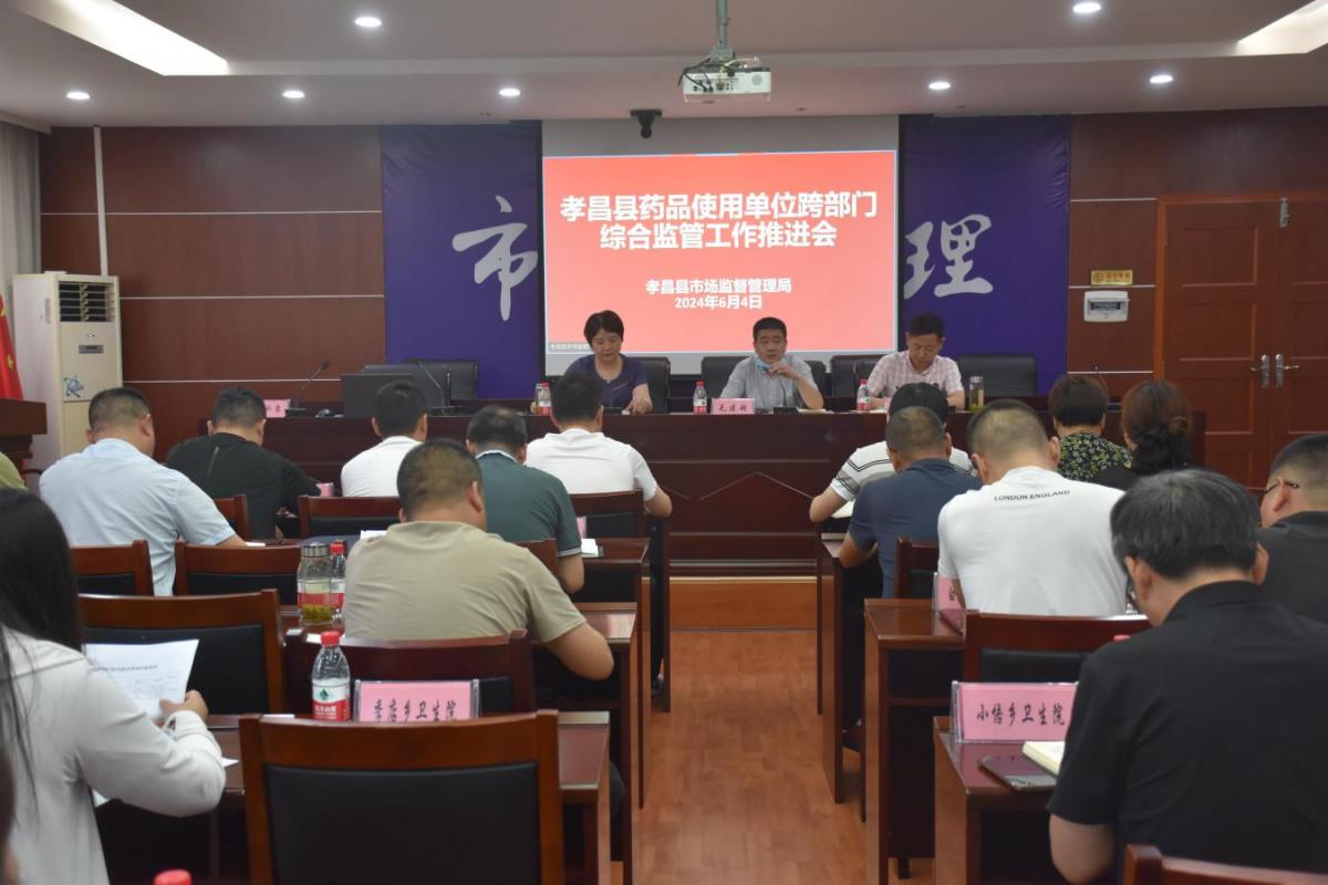 2024年6月4日上午,孝昌县组织召开药品使用单位跨部门综合监管工作推进会,参加会议的有各县级医院、乡镇卫生院、私立医院及县市监局、县卫健局相关人员,县市监局、县卫健局分管副局长出席了会议。