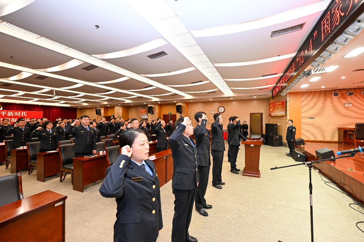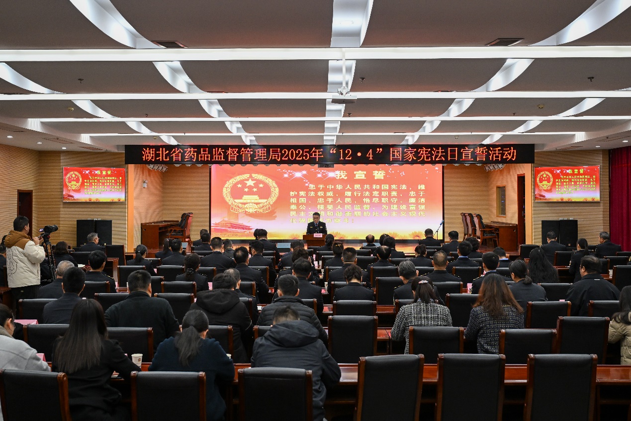 潘年松指出,宪法是国家的根本大法,是治国安邦的总章程,是党治国理政的根本法律依据,是国家政治和社会生活的最高法律规范。弘扬宪法精神、履行宪法使命是每一名公职人员必须遵循的基本行为准则。药品监管干部职工要以此次宣誓为契机,深学笃行习近平法治思想,把宪法精神融入血脉、铸入灵魂,始终做宪法的忠实崇尚者、自觉遵守者、坚定捍卫者。一要铸牢坚定信仰。不断增强宪法意识、强化法治观念,始终在宪法法律范围内履行职责、开展工作。二要践行初心使命。始终把守护人民群众生命健康作为药品监管工作的出发点和落脚点,让宪法精神通过执法实践,转化为群众看得见、摸得着的获得感、幸福感、安全感。三要强化担当作为。以宪法为遵循,严格落实“四个最严”,围绕“七大战略”,提升“七个能力”,全链条强化药品安全监管、全环节筑牢药品安全底线、全方位支持生物医药产业发展,在高质量发展大局中展现药监担当。四要严守纪律底线。始终牢记宣誓誓词中“恪尽职守、廉洁奉公”的要求,不断强化涉企执法和检查行为的规范,始终保持对宪法法律的敬畏之心,自觉接受人民监督,以清正廉洁的作风维护宪法尊严、彰显法治公信力。