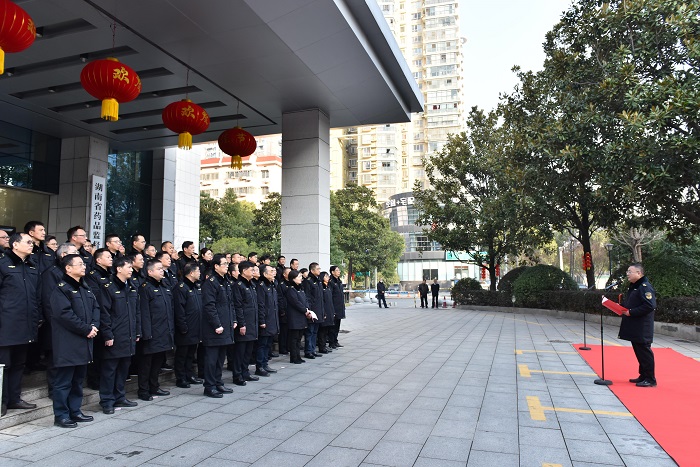 国旗飘扬,国歌雄壮。1月28日上午,兔年春节后上班的第一天,省药品监管局举行隆重的升国旗仪式,开启新年工作征程。仪式由局长黄东红同志主持,局党组书记秦继红同志出席并讲话,省局领导、机关全体干部职工、各直属单位班子成员参加了升旗仪式。