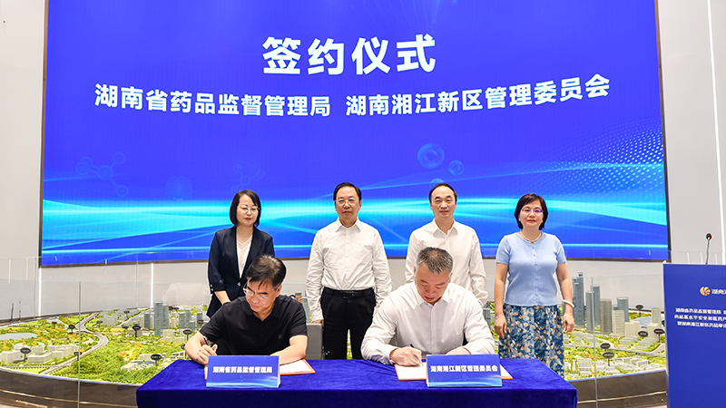 仪式上,省药品监管局副局长彭旭明与湖南湘江新区(长沙高新区)党工委委员、管委会副主任帅军,代表各自单位签署了合作协议。