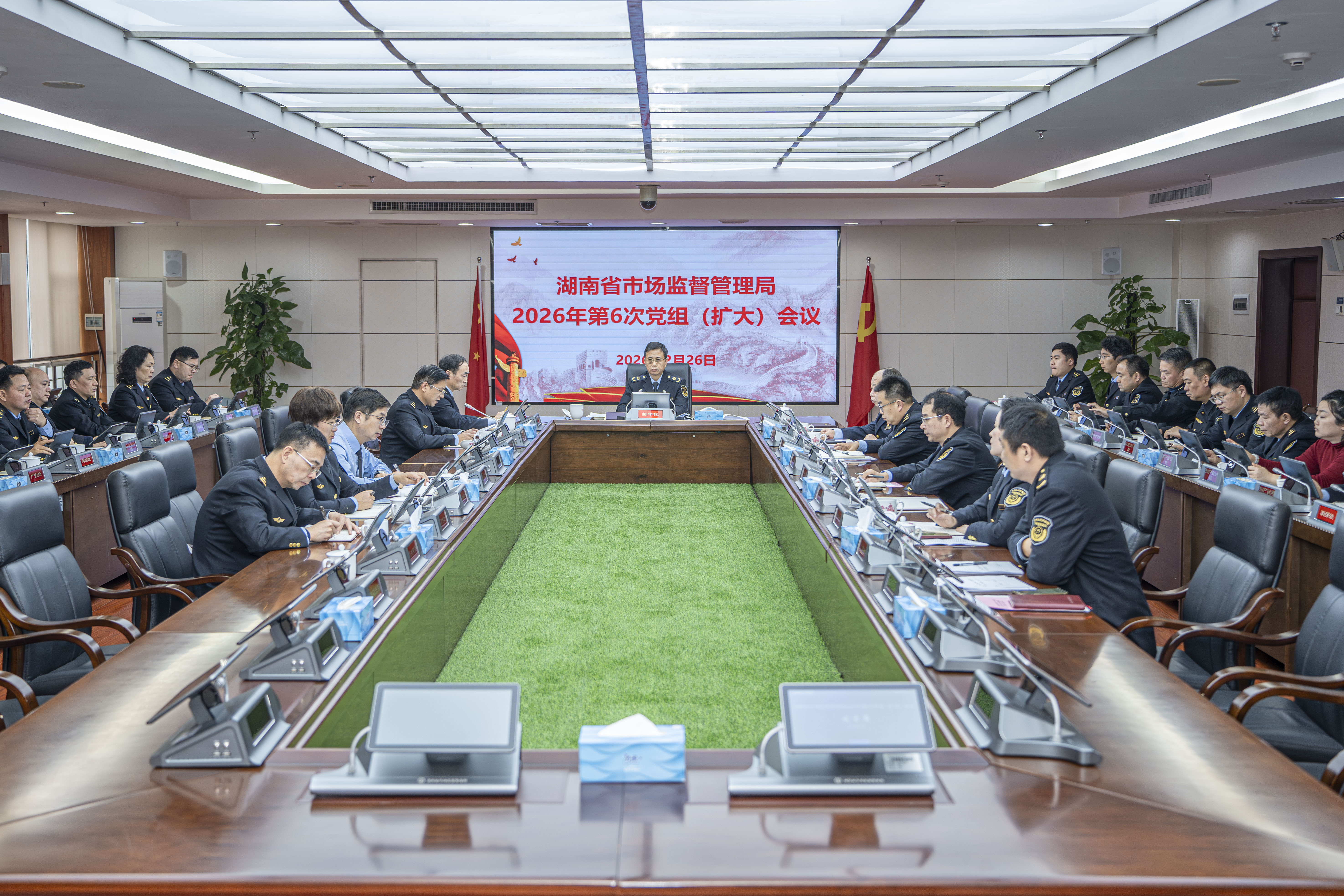 2月26日,省市场监管局2026年第6次党组(扩大)会议召开,传达学习习近平总书记近期重要讲话和重要指示批示精神,落实省委、省政府近期会议部署,研究“三品一特”安全监管、涉企行政检查等工作。省局党组书记、局长彭华松主持会议。