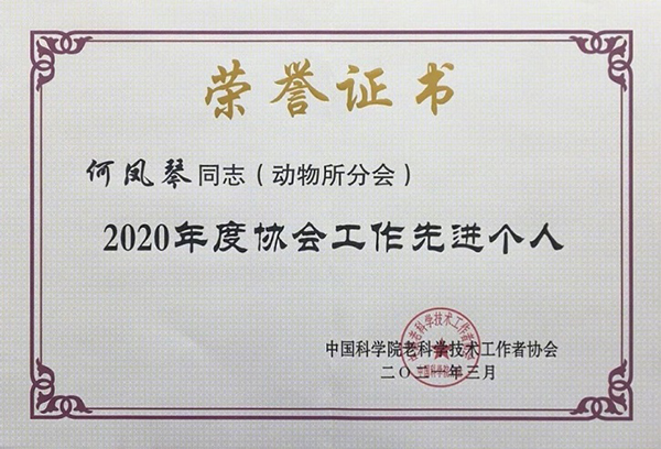 老科协动物所分会荣获“2020年度学术沙龙工作优秀奖”,院老科协理事、分会秘书长何凤琴获“2020年度协会工作先进个人”。