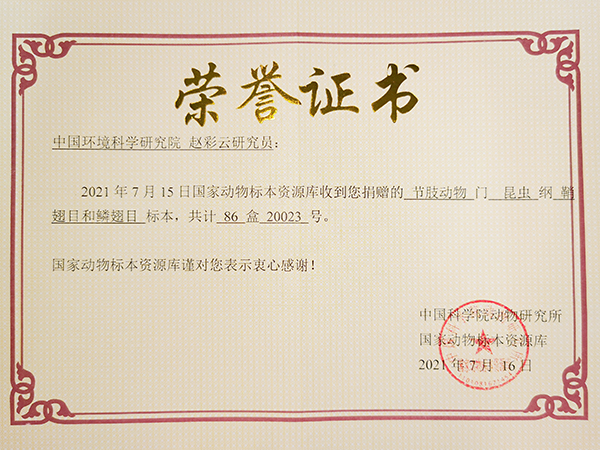 2021年7月15日,中国环境科学研究院赵彩云研究员课题组向国家科技资源服务共享平台馆库——国家动物标本资源库捐赠鞘翅目、鳞翅目等昆虫标本,共计86盒20023号。国家动物标本资源库向赵彩云研究员表示感谢并颁发了捐赠证书,资源库昆虫分馆管理员姜春燕博士、博士生陈燕南和工作人员赵凯东前往中国环科院顺义研究基地接收了捐赠昆虫标本。