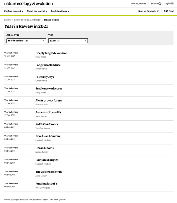 图. 全球共12篇研究论文入选Nature Ecology & Evolution杂志2021年“Year in Review”.