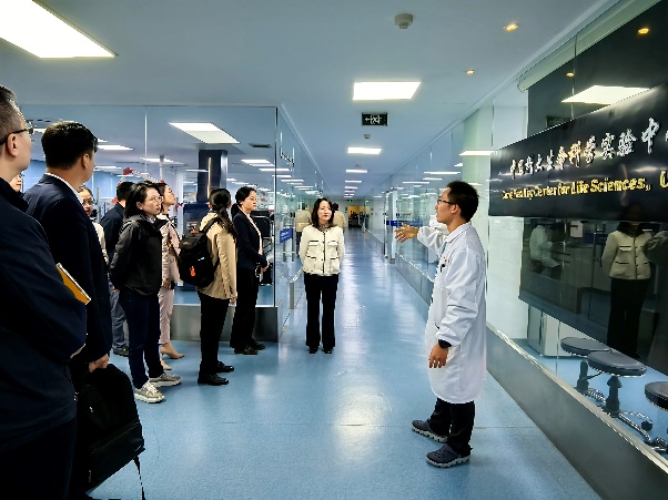 重庆医科大学代表团先后参观了中国科大生医部实验中心、动物平台、毕国强教授课题组实验室以及免疫应答与免疫治疗全国重点实验室和人群队列生物样本资源库,详细了解了中国科大在生命科学、医学研究平台建设、科研组织与成果转化等方面的进展。