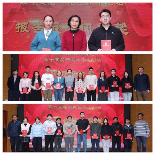经过评委专家的严谨评审与全所师生的积极投票,论坛评选出多项荣誉:李世炜、赵喜源两位同学斩获 “报告最佳风采奖”;李世炜、刘一心、刘兴、薛泊宁、蒋晓钰、吴若晨、赵喜源、于晓璐、张彬、元杨10位同学荣获“优秀报告奖”;于晓璐、杜欣、王逸飞、许展博、邵光硕、张帅、田哲豪、薛泊宁、涂炜山、杜恒10位同学摘得“海报最佳创意奖”。