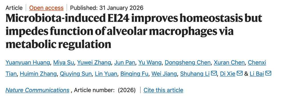 2026年1月31日,免疫应答与免疫治疗全国重点实验室(以下简称“实验室”)白丽教授课题组在Nature Communications在线发表题为“Microbiota-induced EI24 improves homeostasis but impedes function of alveolar macrophages via metabolic regulation”的研究论文。该研究揭示,共生微生物诱导的EI24在维持AMs稳态的同时,抑制其吞噬功能和炎症因子表达,妨碍了AMs介导的抗肿瘤和抗感染免疫应答。同时,研究还发现EI24广泛抑制多种巨噬细胞功能,为靶向EI24发展巨噬细胞的免疫治疗策略提供了理论依据。