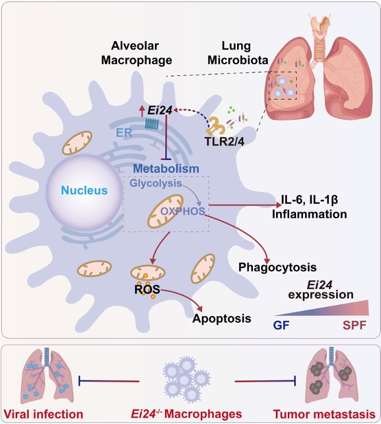 研究团队发现,EI24在AMs中高表达,而在脾脏、肝脏巨噬细胞中低表达。通过巨噬细胞特异性敲除EI24的小鼠模型发现,EI24的缺失促进AMs凋亡,影响了AMs的稳态维持,但不影响脾脏、肝脏中巨噬细胞稳态。在功能方面,EI24缺失显著增强AMs的吞噬能力及促炎性细胞因子产生。进一步在疾病模型中发现,巨噬细胞中特异性缺失EI24可显著抑制小鼠肺脏肿瘤转移和流感病毒感染,且该效应依赖于巨噬细胞本身而非T细胞。机制研究表明,EI24的缺失通过促进线粒体氧化磷酸化和糖酵解增强AMs功能。此外,研究还发现,共生微生物通过TLRs信号通路上调AMs中EI24的表达。无菌小鼠的AMs细胞低表达Ei24,因此,EI24的缺失并不会影响无菌小鼠中AMs的稳态维持。除了肺脏以外,肠道中同样存在大量共生微生物,该研究也证实了肠道巨噬细胞中同样高表达EI24,并且EI24参与肠道巨噬细胞的稳态维持。尽管静息情况下EI24在其他组织巨噬细胞中低表达,活化后,其表达量上调,并广泛抑制这些巨噬细胞的功能。给小鼠转输EI24缺失的骨髓来源巨噬细胞,可有效抑制肺脏肿瘤转移和病毒感染,提示靶向敲除EI24可增强巨噬细胞的免疫治疗疗效。