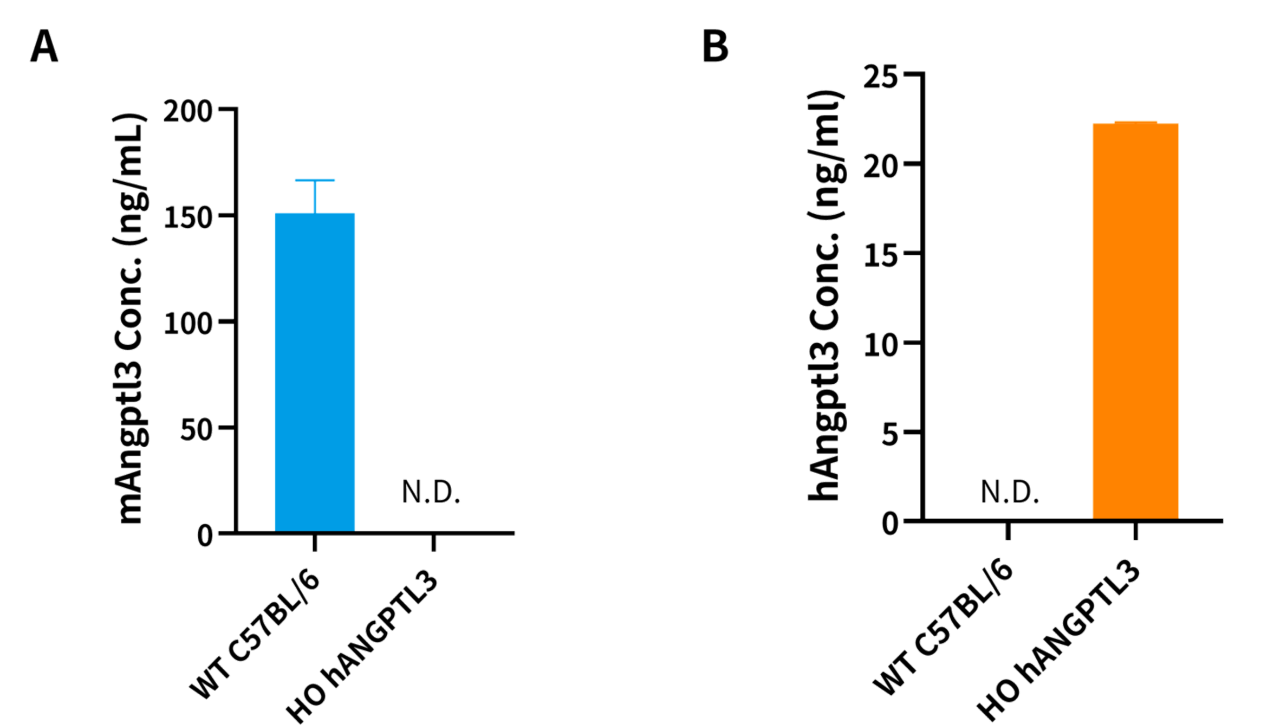 图3. ELISA检测鼠源ANGPTL3以及人源hANGPTL3在hANGPTL3小鼠中的表达。hANGPTL3小鼠中有较高水平的人源ANGPTL3。