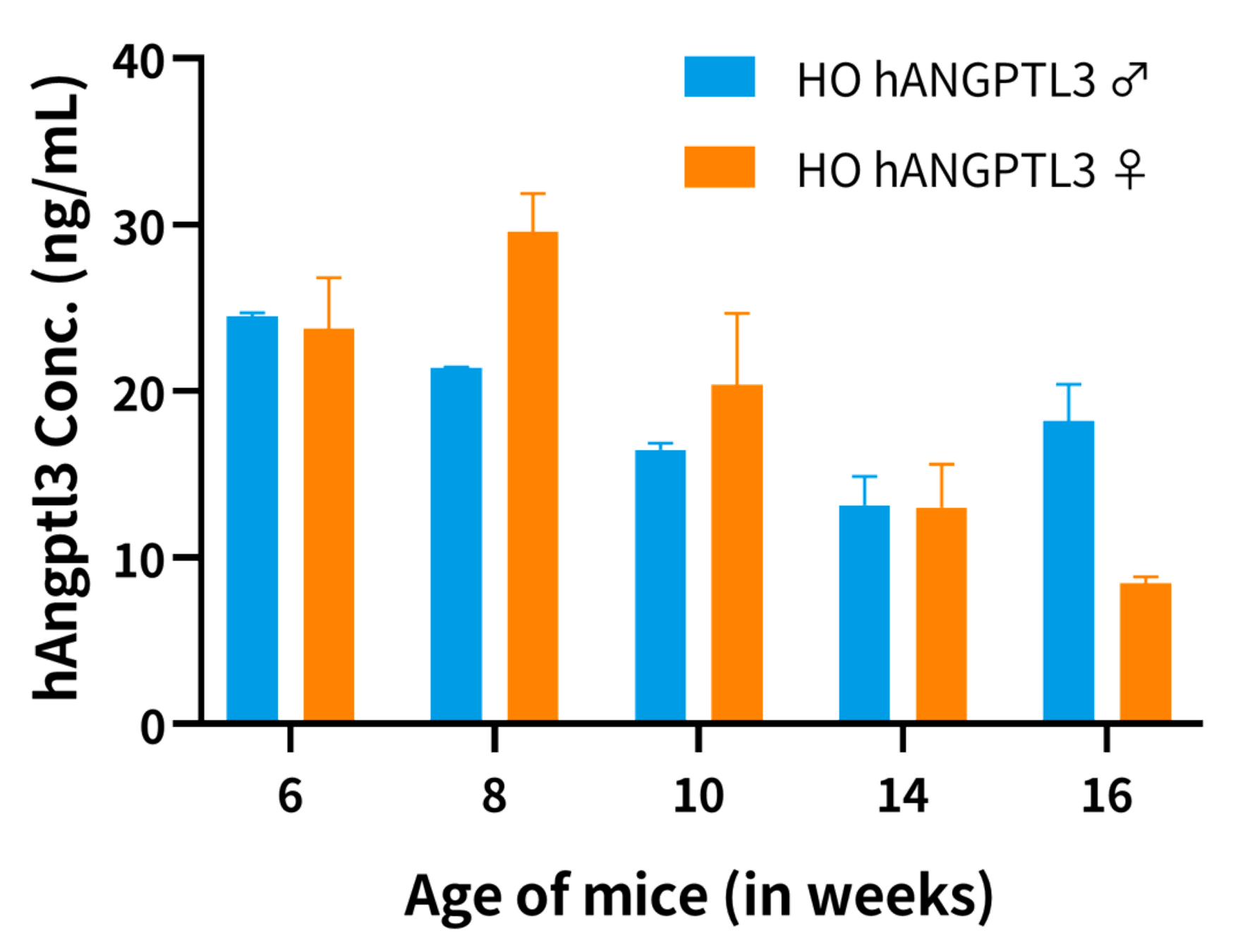 图4. ELISA检测鼠源ANGPTL3以及人源hANGPTL3在不同性别hANGPTL3小鼠中的表达。