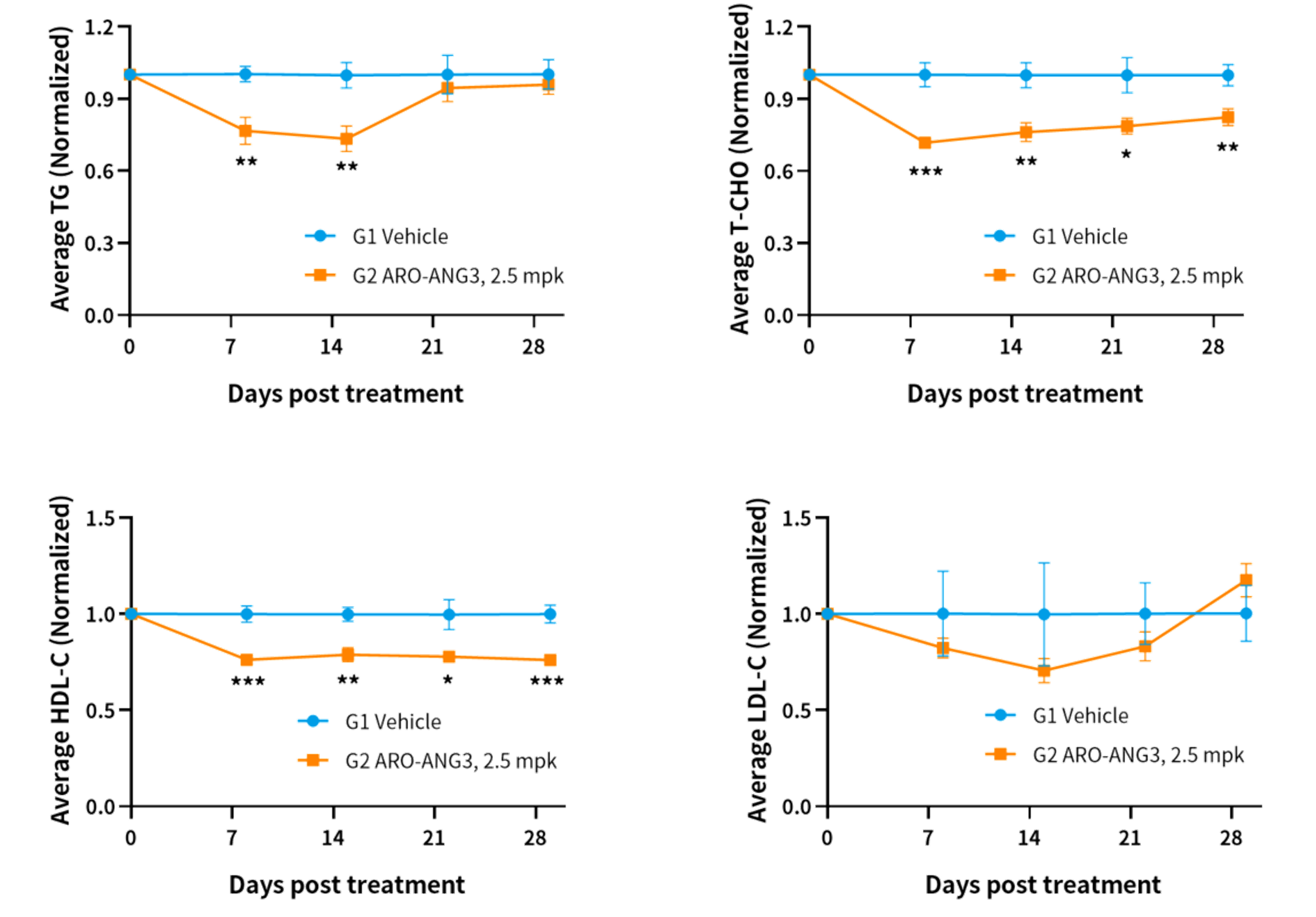 图5. 检测给药前后hANGPT3小鼠的血脂水平。将hANGPT3小鼠随机分为两组(n=8),对小鼠施用ARO-ANG3(一种靶向ANGPTL3的核酸药物),结果显示,ARO-ANG3处理组TG,T-CHO,HDL-C水平显著降低。