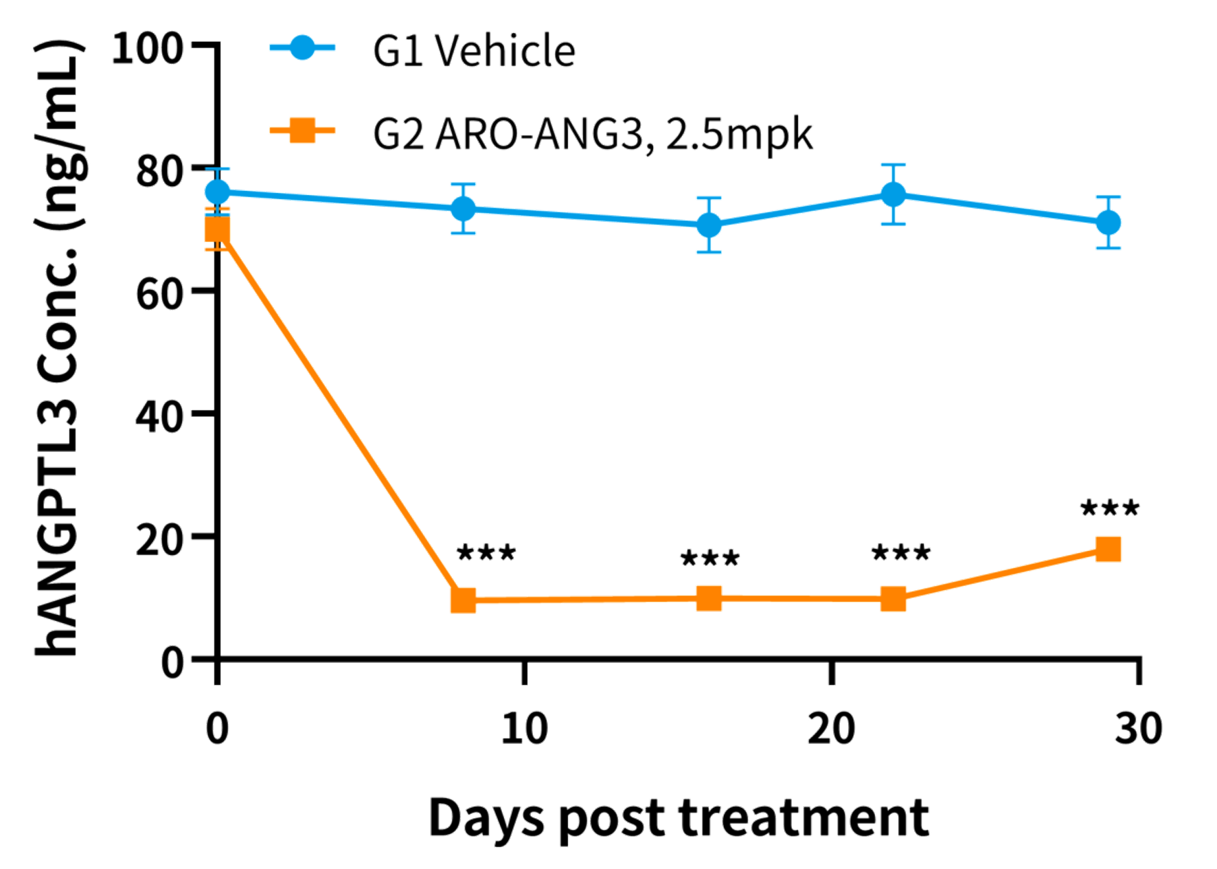 图6. ELISA检测给药前后hANGPT3小鼠的ANGPT3蛋白水平。结果显示,ARO-ANG3处理组的人源ANGPT3表达显着降低。