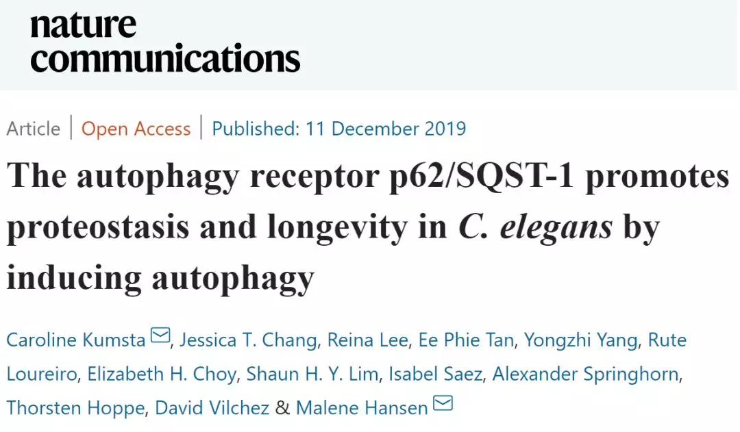 这项研究以The autophagy receptor p62/SQST-1 promotes proteostasis and longevity in C. elegans by inducing autophagy(自噬受体p62/SQST-1通过诱导自噬促进线虫的蛋白质平衡和寿命延长)为题发表在Nature子刊——Nature Communications杂志上。
