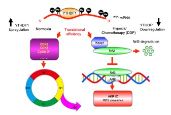 通过合作研究,中科院昆明动物所陈勇彬学科组前期利用进化生物学的方法,筛选得到一系列青藏高原家养哺乳动物低氧适应的关键新分子,并发现许多已报道的肿瘤明星基因在高原家养哺乳动物中受到正选择,提示低氧适应新基因在低氧实体瘤中具有潜在重要功能。研究发现YTHDF1作为m6A修饰后的RNA结合蛋白家族成员之一,在高原家养哺乳动物中低表达,而在正常肺上皮细胞中抑制其表达可以抵抗低氧诱导的细胞凋亡。进一步深入研究发现,YTHDF1在非小细胞肺癌肿瘤组织和细胞系中均高表达,其在常氧条件下通过加速CDK2和CDK4等细胞周期蛋白的表达来促进肿瘤细胞的增殖;而在铂类药物为主的化疗压力环境下,由于YTHDF1高表达促进了Keap1蛋白的表达,导致Nrf2转录因子的迅速降解和下游耐药基因AKR1C1的沉默,因此肿瘤患者对化疗更敏感且总生存时间更长。