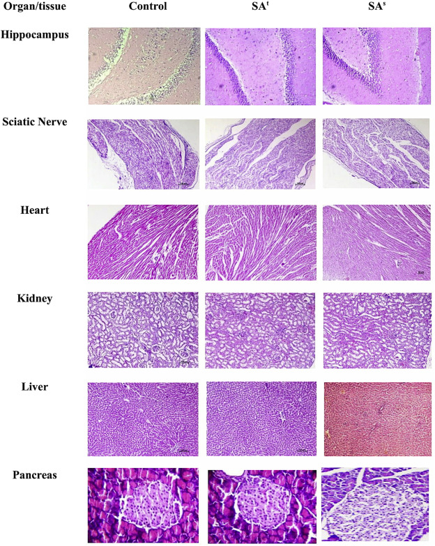 摘要:丁香酸(SA)是一种酚酸,已经进行了多种药理活性的研究,但仍缺乏安全性和/或毒性机制研究。亚急性毒性研究将为其药理作用增加价值。根据OECD TG 40 7 (OECD,2008),大鼠分为3组(n=12)。通过限量试验确定SA的剂量。治疗组和卫星组接受SA(1000 mg/kg/天,p.o持续14天),而对照组给予等量的赋形剂。为了获得可逆性,卫星组在接受SA治疗后再保留14天。记录中毒症状、死亡率和体重变化。第15天和第29天,麻醉大鼠采集血液,以评估血液学和生化参数,然后安乐死收集内脏器官,进行称重和组织病理学研究。通过评估各种生化和血液学参数、相对体重和组织病理学研究证实SA对体重、摄食量、红细胞生成、白细胞减少及内脏器官无明显不良影响。SA在有限的时间内可以被认为是安全的,这项研究可以帮助研究人员确定长期亚慢性研究的剂量。此外,此外,需要进行亚慢性和慢性毒性研究,以评估长期使用的安全性。关键词: 毒理 生理学 亚急性 毒性 丁香酸 多酚 安全性简介:多酚类物质是最大的一类植物化学物质,是植物生产保护自己免受昆虫、蘑菇和疾病侵害的次生代谢产物。分类为黄酮、黄酮醇、酚酸、挥发酚、花青素、儿茶素和单宁。近年来的研究有力地支持了它们在预防疾病,特别是癌症、心血管疾病、糖尿病和神经退行性疾病方面的作用。丁香酸(SA)是酚酸的一种,存在于各种干果(橄榄、枣子)、香料、南瓜、葡萄、阿拉伯棕榈树、蜂蜜、红酒和其他植物中。SA具有多种药理作用,如抗糖尿病、抗菌等。它能抑制醛糖还原酶,表现出抗氧化和抗高血压、肝保护和神经保护活性。具有抗糖化、抗脂肪和抗炎作用,改善糖尿病性白内障。此外,它已被证明具有抗癌特性,保护心脏和大脑/CNS,用于制备牙胶,减少小鼠血栓形成和急性血栓栓塞。SA应该长期用于治疗慢性疾病,因此对其安全性进行评估变得至关重要。然而,据我们所知,在文献中没有SA亚急性毒性的报告是可用的。因此,决定进行亚急性毒性研究。目的探讨SA对大鼠肝、脑、心、肾、坐骨神经等重要内脏器官的安全性。这项研究将增加其药理学价值;为研究人员进行长期毒性研究(亚慢性和慢性研究)提供初步数据。进一步为降低其毒副作用寻找一个平台。方法和材料:在无菌条件下,SA每天溶解在无菌的非致热氯化钠溶液(0.9%w/v)中。世界卫生组织已将氯化钠溶液(0.9%w/v)列入基本药物清单,并认为它是一种对卫生系统有效和安全的药物。健康成年雄性和雌性Wistar白化大鼠在符合标准的环境下饲养。所有动物均适应一周后开展试验。限量试验/剂量选择试验:根据OECDtg 425(OECD,2008),最初给1只大鼠单次口服SA剂量(2000 mg/kg b.w),然后根据死亡率和发病率观察,给另外4只大鼠口服SA(2000 mg/kg b.w)。连续14天观察所有大鼠的死亡率和中毒症状。采用限量试验确定LD50值和亚急性毒性研究剂量。亚急性毒性:根据OECD TG407(OECD,2008),36只大鼠(18只雄性和18只雌性)被随机分为3组,每组12只(n=12)。对大鼠进行标记,以便进行个体识别。雄性和雌性大鼠分别关在不同的笼子里,并对笼子进行编号。大鼠分组如下。对照组(1A(雄性)和1B(雌性))接受氯化钠溶液(0.9%w/v)14天。治疗组〔2A(雄性)和2B(雌性)〕接受SA(1000 mg/kg/天,p.o)治疗14天。卫星组〔3A(雄性)和3B(雌性)〕接受SA(1000 mg/kg/天,P.O)持续14天,并在治疗后观察14天。每天观察所有动物的死亡率,每周记录生活中的临床症状、体重、食物和饮水摄入量。对照组和治疗组动物于第15天处死,按照实验设计进行必要的评估。为了获得可逆性或恢复;卫星组在治疗后继续治疗14天。每天观察大鼠死亡率。第21天和28天测量额外的体重,食物和水的摄入量。在第29天,处死大鼠。临床观察:每天观察两次动物的死亡率。对照组和治疗组动物第0、7、14天在处理期间和在旷场观察临床症状。在第21天和第28天观察卫星组动物。临床症状包括感觉器官(如皮肤、眼睛、鼻子)、身体分泌、自主活动(呼吸频率、瞳孔大小、毛竖立)、抓握时反应、行走方式、叫声、肌肉震颤和行为等的变化。动物在分组前称两次体重。记录治疗组和对照组在第1天(给药前)、第7天、第14天和第15天(处死前空腹体重以计算相对体重)的体重。在第21天、28天和29天(处死前),继续每周测量卫星组动物的体重。在试验期结束时,计算各组的平均体重增加。在整个研究过程中,动物可以随意饮食和饮水。在第1天(给药前)、第7天和第14天测量治疗组和对照组动物的食物和水消耗量。在第21天和第28天继续对卫星组动物进行测量。实验结束前,动物禁食一晚。血液学分析:在研究结束时,所有存活的动物都被异氟烷麻醉,血液样本通过下腔静脉收集到预先校准的涂有乙二胺四乙酸(EDTA)的试管中,进行血液学评估。参数如下:红细胞计数(RBC)、血红蛋白浓度(HBG)、血小板计数(PLT)、填充细胞体积(PCV)、平均红细胞体积(MCV)、平均红细胞血红蛋白(MCH)、总白细胞数(TWBC)、平均红细胞血红蛋白浓度(MCHC)和差异白细胞计数,包括嗜中性粒细胞(N%)、嗜酸性粒细胞(E%)、淋巴细胞(L%)和单核细胞(M%)。血生化:采集未肝素化的血样进行生化检测。将凝固后的血样在2000 g下离心获得血清。将血清放入新的试管中,在-20℃下保存,直到分析。采用分析级试剂盒分光光度法测定血清生化指标。参数包括血糖(BG)、尿素氮(BUN)、肌酐(CR)、总蛋白(TP)、白蛋白(ALB)、总胆红素(TB)、