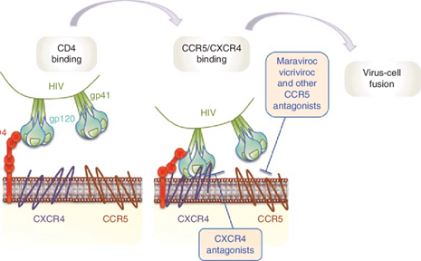 CCR5基因是由邓宏魁在1996年发现的,并证实CCR5是HIV病毒进入细胞的受体,这是HIV治疗的重大发现,目前这篇论文的引用次数已经超过4000次。HIV病毒外膜有gp120和gp41两种病毒蛋白,当T淋巴细胞的表面含有CD4时,gp120可以与其结合,使HIV吸附于宿主细胞上。除了CD4外还有CCR5受体,可以使病毒与宿主细胞进一步结合。然后通过gp41蛋白使病毒包膜与细胞膜融合,病毒RNA进入细胞。HIV破坏淋巴细胞,造成人体免疫功能丧失。