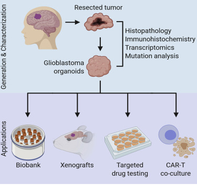 近日,美国宾夕法尼亚大学等科研机构的科研人员在Cell上发表了题为“A Patient-Derived Glioblastoma Organoid Model and Biobank Recapitulates Inter- and Intra-tumoral Heterogeneity”的文章,建立了病人源性胶质母细胞瘤类器官模型和生物库,涵盖了肿瘤内及肿瘤间异质性。胶质母细胞瘤表现出明显的肿瘤内和肿瘤间异质性,从而使开发有效治疗方式变得复杂。目前体外模型在保留亲本肿瘤细胞和突变多样性方面较局限,并且需要更长的产生时间。该研究中,科研人员发现了生成和保存病人源性胶质母细胞瘤类器官(glioblastoma organoid,GBO)的方法,涵盖了亲本肿瘤的组织学特征、细胞多样性、基因表达和突变特征。GBO能够可靠快速产生,并且移植到成年啮齿动物大脑后会表现出快速侵袭性。科研人员通过检测GBO突变谱与对特定药物的反应和通过对嵌合抗原受体T细胞免疫疗法的建模,进一步证明了GBOs测试个体化治疗的实用性。