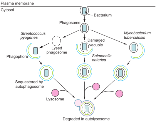 图3.细胞内细菌被自噬降解。化脓性链球菌溶解噬菌体并逃逸到胞质中,在胞质中被自噬体隔离,最后在自溶体中降解[16]。