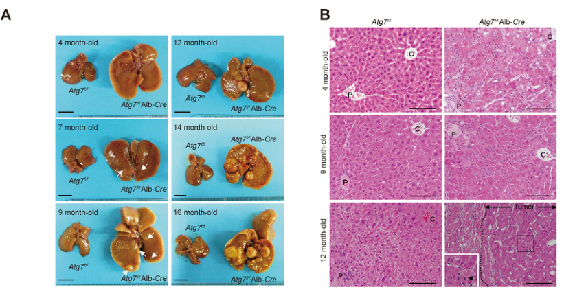 图5.肝脏中Atg7缺失,引发肝腺瘤(小鼠肝脏的不同解剖时间及HE染色)[25]。