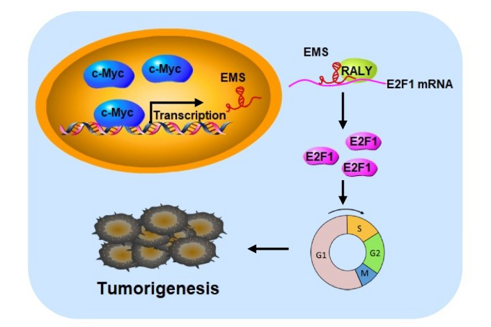梅一德研究组通过数据库分析和实验验证,鉴定了一个新的在多种类型肿瘤包括肺癌、乳腺癌和肠癌中异常高表达、且具有促癌功能的长链非编码RNA,并将其命名为EMS(E2F1 mRNA stabilizing factor)。EMS作为c-Myc的直接转录靶标,能够介导c-Myc通过控制细胞周期运转促进肿瘤形成的作用。在分子机制层面,EMS通过与RNA结合蛋白RALY相互作用,从而稳定细胞周期关键调控因子E2F1的mRNA并增强其蛋白表达水平,最终促进G1/S细胞周期运转以及肿瘤细胞的快速增殖。该研究阐明了EMS这一长链非编码RNA能够作为信使分子传递c-Myc的促癌信号,为深入理解c-Myc促进肿瘤形成的分子基础提供了新的视角,并暗示EMS可能作为肿瘤治疗的一个新的潜在靶标。