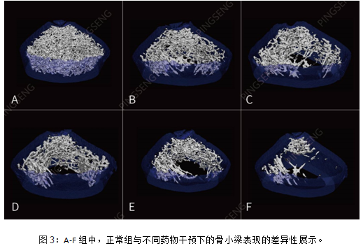 例:有A-F编号的6个实验大鼠离体股骨样本,其中A是正常对照组,B到F为骨质疏松组(去卵巢造模)使用不同抗骨质疏松药物干预。分割处理如图1所示;感兴趣区骨小梁的展示如图2;ROI骨小梁和ROI皮质骨的相关骨参数计算如表1.