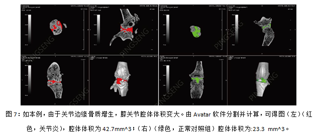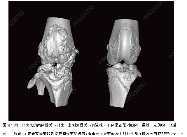 建立骨关节炎(OA)动物模型是寻找关节炎疾病有效治疗措施的重要途径。因显微CT可探测骨髓和骨皮质的微小结构改变,与其他影像学方法相比,在评估小关节中有很大的优势。利用显微CT可以评估骨性关节炎进展中软骨骨质的微小变化,评估骨密度以及软骨骨化情况来研究骨性关节炎的病理生理,以及软骨中的钙质沉积变化。