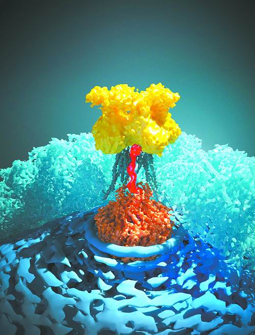人类Ⅰ型单纯疱疹病毒(HSV-1)DNA通道蛋白的原子分辨率三维结构5月30日,《自然》杂志在线发表了中国科大合肥微尺度物质科学国家研究中心、生命科学学院刘云涛博士、毕国强教授与合作者的研究论文。他们利用冷冻电镜首次解析了人类疱疹病毒基因组包装的关键机制及病毒的DNA基因组结构,有助于预防和控制疱疹病毒引发的多种疾病,并改造疱疹病毒用于靶向治疗。疱疹病毒是一类在自然界广泛存在的病毒,在感染人体后能够引发多种疾病,包括带状疱疹、出生缺陷、多种免疫系统疾病以及癌症。疱疹病毒包括囊膜、中间体蛋白层、核衣壳和基因组四层结构,其中核衣壳通常被视为一个正二十面体,其上有一个独特的DNA通道,是病毒基因组进出的地方。由于缺乏病毒基因组和衣壳DNA通道的高分辨结构,人们对于病毒粒子的基因组包装过程知之甚少。在疱疹病毒生命周期中,最关键的过程之一就是将DNA剪切酶“召集”到衣壳独特的DNA 通道上,识别、包装和切割双链DNA,最终产生含有基因组的病毒粒子。当病毒基因组在病毒衣壳内装满后,会发出某种信号,从而切除冗余的DNA以完成组装。研究人员建立了一套特殊算法,利用冷冻电镜获得了疱疹病毒衣壳上DNA通道的原子分辨率结构以及大部分基因组的高分辨率三维结构,发现病毒基因组具有左手超螺旋的缠绕方式和一个无序核心,并且揭示了病毒基因组包装信号的传导方式及基因组如何通过衣壳DNA通道。该研究展示了疱疹病毒完整的非对称结构,获得了第一个真核生物病毒的DNA通道原子模型,也是第一次探测到DNA在通道里的扭曲状态。审稿人评论说:“作者采用最前沿的局部分类方法对疱疹病毒结构进行了完美解析,堪称高分辨冷冻电镜三维重建的匠心力作。”毕国强介绍说,通过理解疱疹病毒DNA转运及基因组包装信号获取和传递的基本规则,一方面,有针对性地用于疱疹病毒引起的疾病预防和控制;另一方面,有助于对疱疹病毒进行改造,使其成为更实用的载体工具,并用于肿瘤靶向治疗或大脑神经环路示踪等。该研究是中国科大合肥微尺度国家研究中心集成影像中心的又一里程碑式成果。集成影像中心是合肥微尺度物质科学国家研究中心与生命科学学院为推进交叉学科发展而建设的创新研究与公共技术平台。相关论文信息:https://www.nature.com/articles/s41586-019-1248-6 - THE END -