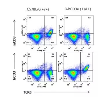 流式分析结果显示:野生型 C57BL/6 小鼠中检测到mCD3+蛋白表达,纯合B-hCD3e小鼠中检测到hCD3+蛋白表达。