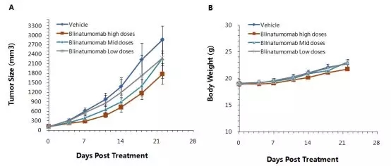 结果表明:高剂量的hCD3e双特异性抗体(Blinatumomab)能够显著抑制肿瘤生长。证明B-hCD3e小鼠可以评估双特异性抗体体内药效。A.肿瘤体积±SEM B.小鼠平均体重±SEM。