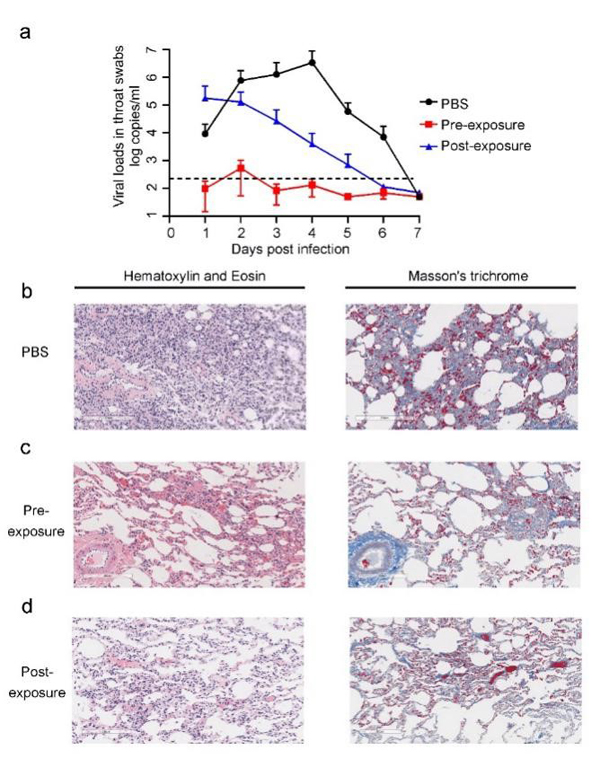 图2:抗体CB6能够有效降低恒河猴体内SARS-CoV-2载量及减弱肺部损伤