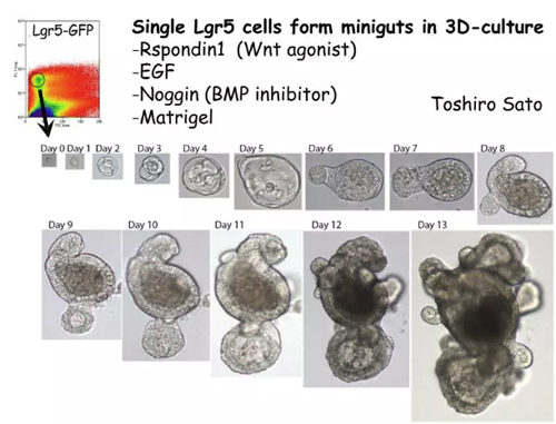 图1. 单个的Lgr5-GFP会逐渐增殖分裂形成类器官的过程[1]