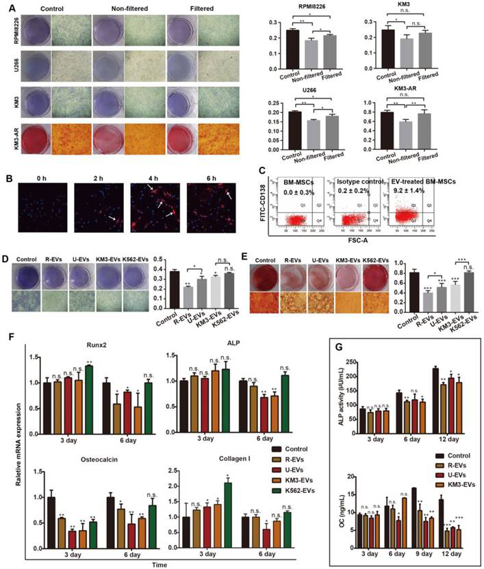 接着,研究人员试图确定MM-EV是否会影响BM-MSC的成骨功能。他们用80%成骨分化培养基和20%未过滤MM细胞培养基(RPMI8226、U266和KM3)或条件细胞培养基(通过离心和过滤去除EV)处理BM-MSC。21天后,通过染色检查BM-MSC的成骨细胞克隆数CFU-OB,他们观察到未过滤的培养基比条件培养基具有更明显的抑制作用。这些结果表明,EV对BM-MSC发挥成骨抑制作用。其中,原代BM-MSC及成骨分化培养基购自赛业生物。