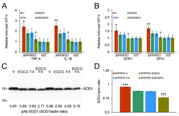 图片来源:Journal of Biological Chemistry研究人员表示这项近期发表在《Journal of Biological Chemistry》的研究是在小鼠身上进行的,但是很多来自小鼠的发现无法在人类身上成功地复制。无论如何,这项研究为某些现成的、以植物为基础的补充剂可能对预防人类痴呆症提供保护的观点增加了可信度。“任何人都不想花10-12年去等一种新设计的新药推向市场,你可以今天就改变你的饮食。”该研究通讯作者、USC凯克医学院生理学和神经科学教授Terrence Town说道。“我发现这是非常鼓舞人心的。”此外,这项研究还表明联合疗法也许是治疗阿尔兹海默症的最好方法。在这项研究中,研究人员发现了2种化合物联合可以逆转阿尔兹海默症:绿茶的关键成分表没食子儿茶素没食子酸酯(Epigallocatechingallate,EGCG)和胡萝卜、马铃薯、大米、小麦等农作物中的阿魏酸(FA)。研究人员随机将32只患有阿尔兹海默症样症状的小鼠分为4组,每组雌雄数量一致。为了对比,每组小鼠还包含相同数量的健康小鼠。研究人员在3个月的时间例给小鼠服用EGCG加FA、EGCG、FA或者安慰剂。剂量是30 mg/kg体重——人体可以耐受这一剂量,也可以通过健康的饮食或者补充剂获得。在进行试验前后,研究人员对小鼠进行了一系列的神经心理学测试,相当于人类的思考和记忆测试。特别值得注意的是一个Y形迷宫,它测试老鼠的空间工作记忆——人类通过它找到走出建筑物的方法。健康的老鼠本能地探索Y型迷宫的每条手臂,寻找食物或逃跑的路线,并按顺序进入这三条手臂,而不是随机乱跑,但是患病的小鼠就无法正常完成这些测试。“3个月后,联合治疗完全恢复了小鼠的工作记忆能力,并逆转了阿尔兹海默症的症状,这些小鼠的表现和正常小鼠无异。”Town说道。那么这种疗法是如何发挥作用的呢?Town表示一种机制可能是这些物质可以防止淀粉样前体蛋白破坏形成beta淀粉样蛋白,阿尔兹海默症患者大脑中富含这种蛋白质。此外,这些化合物似乎可以降低大脑中的神经炎症和氧化压力——这是人类阿尔兹海默症患者大脑中的关键病理特征。Town表示他和他的实验室将继续探索这种联合疗法,将聚焦于使用植物来源的物质抑制beta淀粉样蛋白板块的形成。参考资料:Takashi Mori et al, Combined treatment with the phenolics (?)-epigallocatechin-3-gallate and ferulic acid improves cognition and reduces Alzheimer-like pathology in mice, Journal of Biological Chemistry (2018). DOI: 10.1074/jbc.RA118.004280