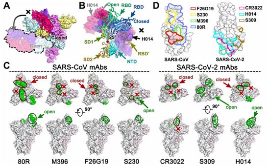 类似于RBM的是,这个H014表位只能在开放状态下访问,这表明它存在这种类似于RBM的作用---涉及对与宿主细胞的相互作用的动态干扰。这些作者观察到的结构连同以前报道的冠状病毒S结构(不包括人类冠状病毒HKU1),已揭示了S1亚基的呼吸介导“关闭”和“开放”构象之间的过渡(图4A)。与大多数结构中观察到的RBD的铰链状运动不同的是,在这些作者的结构中观察到的从“关闭”到“开放”的构象转变主要涉及两个旋转步骤:1)SD1围绕铰链点(在氨基酸残基320处)逆时针旋转大约25°;2)RBD自身逆时针旋转大约60°(图4B)。SD1和RBD在近端位置的构象旋转会导致远端位置的变化放大,从而为H014或ACE2的结合开辟了足够的空间(图4B)。不明确的地方在于,在这些作者的复合物结构中观察到的特殊构象转变是H014参与的结果,还是SD1和RBD协同运动的结果。