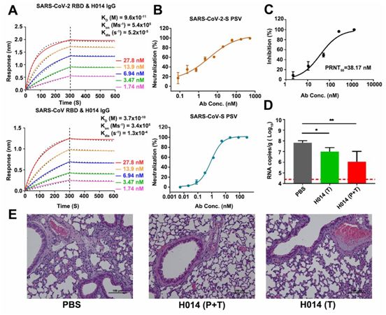 在测试的抗体中,对SARS-CoV-2假病毒具有强效中和活性的抗体克隆014进行人源化,并将它命名为H014。为了评估结合亲和力,利用OCTET系统监测H014与SARS-CoV-2 RBD或SARS-CoV RBD的实时结合和解离。H014 IgG和它的Fab片段均表现出与SARS-CoV-2 RBD和SARS-CoV RBD的紧密结合,与这两种RBD在亚nM水平上具有相当的结合亲和力(图1A)。