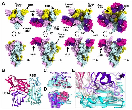 图2.SARS-CoV-2 S蛋白三聚体与H014形成的复合物的低温电镜(Cryo-EM)结构,图片来自Science, 2020, doi:10.1126/science.abc5881。
