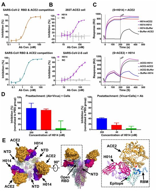 为了验证H014对S蛋白三聚体的潜在完全封闭,这些作者进行了两组表面等离子共振(SPR)测试,先将S蛋白三聚体暴露于H014,然后再暴露于hACE2,或者反过来。正如预期的那样,H014的结合完全阻断了hACE2对S蛋白三聚体的附着。再者,hACE2可以从S蛋白三聚体移出而被H014取代(图3C)。为了在一种基于细胞的病毒感染模型中进一步验证这些结果,他们进行了实时RT-PCR分析,以定量确定残留在4℃下在病毒附着之前或之后暴露于抗体中的宿主细胞表面上的病毒载量。