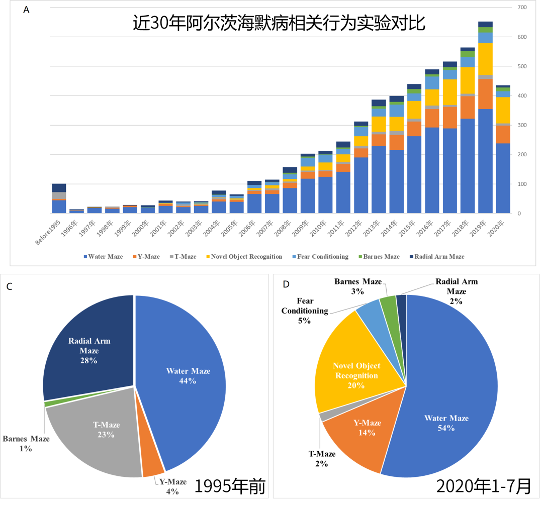 从80年代初被发明之后,水迷宫逐渐成为AD认知记忆实验中的“主力”。当我们同时以阿尔茨海默症和行为学实验名称进行搜索时,水迷宫的检索所得项目要远多于其他任何行为学实验(图1A)。而且水迷宫对AD行为学研究的统治地位是与日俱增的,在1995年之前,水迷宫实验占列入统计的7种行为学文献总数的44%(图1B),但是到了2020年,这一比例已经增长到了54%(图1C)。由此可见AD研究中水迷宫所处的“统治地位”。