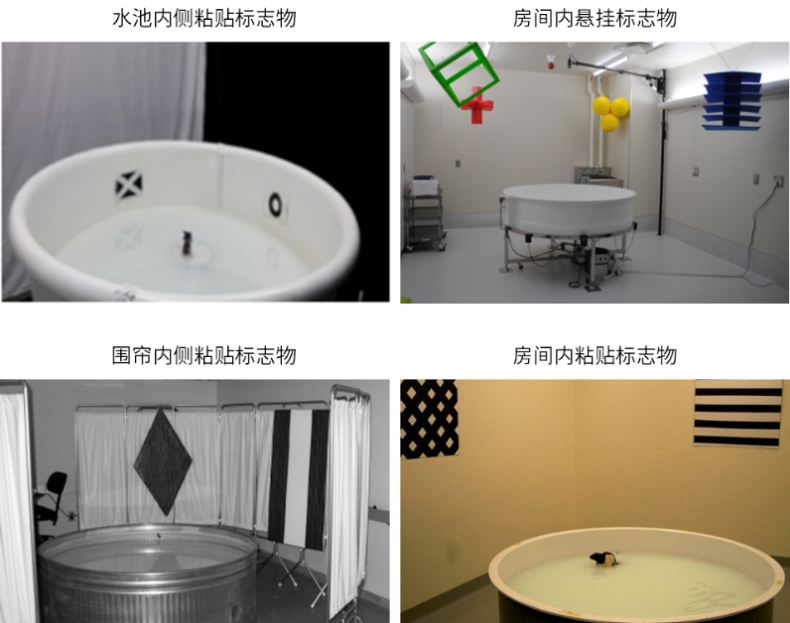 标志物是动物进行空间定位的关键,所以相互之间的区分尤为重要。这些标志物可以放置在迷宫之外,也可以在迷宫之内,目的是让小鼠游泳时能看到。水迷宫内部的标志物一般直径15cm左右,而外部标志物则没有大小的限制。标志物的数量一般在三个或者三个以上,相互之间形状区分要显著。