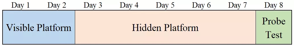 平台隐藏期实验完成后一段时间(具体时间间隔根据实验目的决定),撤去平台,将小鼠从1号位放入(平台隐藏期一直没有用到的离目标平台最远的位置),记录小鼠运动过程以便后来分析。