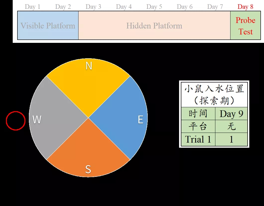 (2)将水池分为四个象限,分别用N,S,W,E命名,此外再设定8个放小鼠下水的方位,从9点钟的1号位置开始逆时针到10点钟位置的8号位,当然这种位置的序号是可以自定义的。
