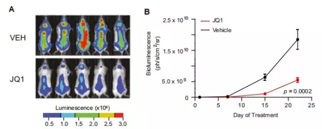 下面随小编一起来看一组活体成像技术在多发性骨髓瘤血液系统疾病上的应用示例:Myc基因是细胞增殖的主要调节因子,而且对于癌症肿瘤细胞分裂,新陈代谢和存活都有重要作用。JQ1是用来抑制BET溴区结构域的小分子,而且可以下调Myc基因转录水平。将JQ1腹腔注射到荷多发性骨髓瘤(经Luciferase标记)小鼠中,活体成像系统显示JQ1可以抑制骨髓肿瘤细胞生长且提高肿瘤小鼠的存活率(图3A-B)。结果说明应用JQ1能够缓解骨髓瘤癌症症状(肿瘤发展与荧光强度线性相关)。[5]