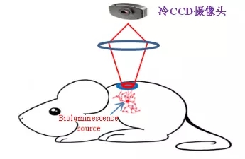 生物发光主要是应用荧光素酶(Luciferase)对基因、细胞和活体动物进行标记。标记细胞的方法基本上是通过分子生物学克隆技术,将荧光素酶的基因插入到预期观察的细胞染色体内,通过对克隆细胞进行筛选,培养出能稳定表达荧光素酶的细胞株。再将细胞株转移至特定的小鼠体内形成模型。向模式小鼠注射一次荧光素(荧光素酶的底物)能保持其体内荧光素酶标记的细胞发光持续30-45分钟。因为每次荧光素酶催化反应只能产生一个光子,这是肉眼无法观察到的,因此需要先进的成像系统,再应用一个高度灵敏的制冷CCD相机以及特别设计的成像暗箱和成像软件,才可观测并记录到这些光子(图3)。[1,3,4]