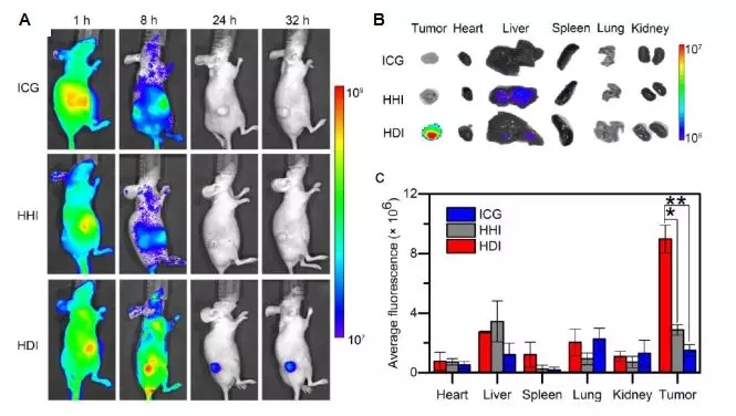 图5.小鼠静脉注射HDI纳米荧光探针后C8161黑色素瘤在体内和体外荧光成像图[6]