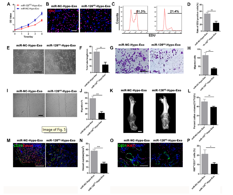 之后,研究人员通过实验证实,来自Hypo-Exo中的miRNA可能发挥生物学作用,并最终促进骨折愈合。具体是哪个或哪些miRNA?他们开展了miRNA芯片分析,发现Hypo-Exo组中有94个miRNA上调,39个下调。其中,miR-126的表达明显上调,且已知其对血管生成具有积极作用。于是,他们后续的研究重点放在miR-126上。