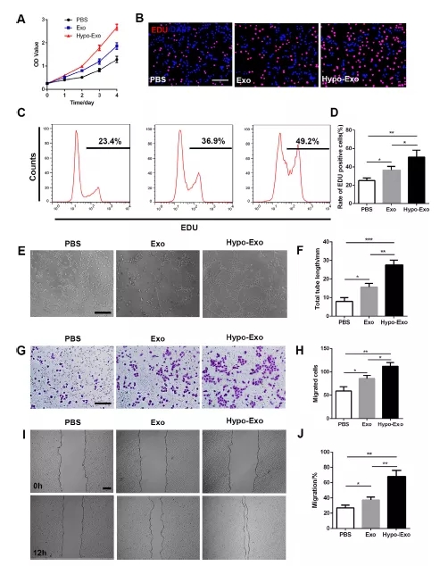 为了确定Hypo-Exo在体外是否发挥相似的治疗作用,研究人员利用人脐静脉内皮细胞(HUVEC)开展体外实验。细胞增殖分析表明,与Hypo-Exo共同孵育导致HUVEC的增殖显著增加。同时,细胞迁移分析也表明Hypo-Exo增强了血管形成能力。这些结果表明,与体外的PBS和Exo处理相比,Hypo-Exo可大大促进增殖、迁移和血管形成(图1)。